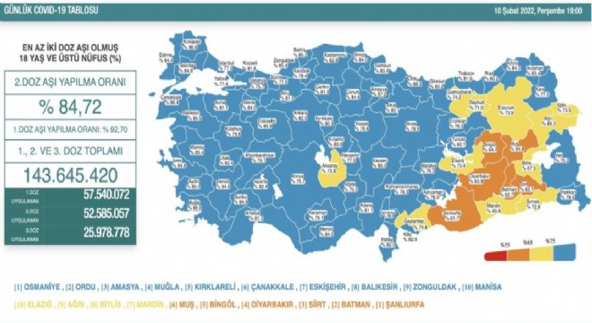 Sağlık Bakanlığı tarafından Türkiye'nin yeni korona virüs tablosu açıklandı 10 Şubat’ta açıklanan 24 saatlik verilere göre 98 bin 602 vaka tespit edildi. Virüs nedeniyle hayatını kaybedenlerin sayısı 264 oldu. Bir günde toplam 450 bin 044 test yapılırken, iyileşen hasta sayısı 87 bin 932 olarak kaydedildi. Sağlık Bakanlığı tarafından açıklanan tabloda, 2 doz aşılama verilerine de yer verildi. En az 2 doz aşı olmuş 18 yaş üzeri nüfusu kapsayan verilere göre Türkiye'de 2. doz aşılama ortalama yüzde 84,72 oldu. 1. doz ortalaması yüzde 92,70 olurken, 1., 2. ve 3. doz aşısını olan vatandaş sayısı toplamda 143 milyon 645 bin 420 ’e yükseldi.