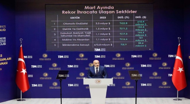 “Depremzedelerin yaralarını sarmaya çalışırken üretimin ve ihracatın devam etmesi bizim için büyük önem arz ediyor. Özellikle Mart ayında ortaya koyacağımız performans çok önemliydi. İhracatçımız bu büyük sınavı başarıyla geçti. Genel Ticaret Sistemi (GTS) kayıtlarına göre Mart'ı 23,6 milyar dolar ihracatla tamamladık. Geçen yılın aynı ayına göre yüzde 4,4 artıdayız. Bu sonuçla aynı zamanda Cumhuriyet tarihimizin en yüksek aylık ihracat değerine ulaştık. Ocak-Mart dönemini kapsayan ilk çeyrekteki ihracatımız yüzde 2,5 artışla 61,6 milyar dolara yükselirken, son 12 aylık ihracatımız ise 255,7 milyar dolar oldu. Geçen ay ihracatımıza en yüksek katkıyı 3,3 milyar dolarla yine otomotiv sektörümüz verdi. İlk beşteki diğer sektörlerimiz 2,9 milyar dolarla kimya, 2 milyar dolarla hazır giyim, 1,5 milyar dolarla elektrik elektronik ve 1,4 milyar dolarla çelik şeklinde sıralandı. Mart ayında 38 ilimiz ihracatını artırdı. En çok ihracat yapan ilk beş ilimiz İstanbul, Kocaeli, Bursa, İzmir ve Ankara oldu. Geçen ay bin 903 firmamız ihracat ailesine katıldı. Birim ihracat değerimiz ise geçen yılın aynı ayına göre yüzde 24,4 artışla 1,67 dolara yükseldi.”