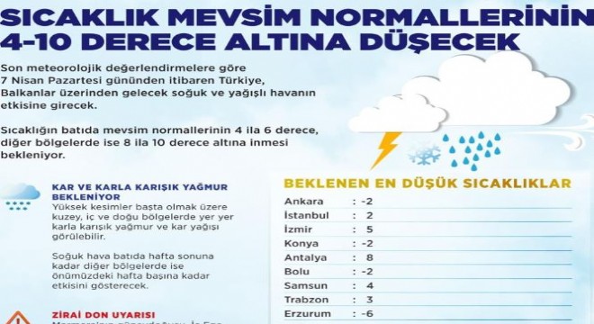 Mevsim normalleri civarında seyreden hava sıcaklıkları, yarından itibaren kuzeybatı kesimlerden başlayarak yurt genelinde azalacak. Sıcaklığın batı kesimlerde mevsim normallerinin 4 ila 6 derece, diğer bölgelerde ise 8 ila 10 derece altına inmesi bekleniyor. Soğuk havanın, yurdun batısında hafta sonuna kadar, doğusunda ise önümüzdeki hafta başına kadar etkili olacağı tahmin ediliyor. Soğuk havayla birlikte, yüksek kesimler başta olmak üzere kuzey, iç ve doğu bölgelerde yer yer karla karışık yağmur ve kar yağışlarının görülmesi bekleniyor.