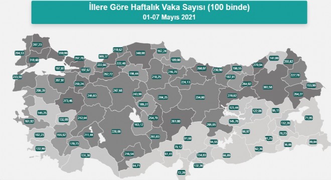 Sağlık Bakanlığı iller bazlı her yüz binde haftalık vaka sayılarını açıkladı. Vaka sayısı dağılımı şöyle: İstanbul 359,99, Kastamonu 340,08, Tekirdağ 318,48, Zonguldak 309,37, Erzurum 303,58, Kocaeli 297,76, Kırklareli 287,23, Bolu 282,72, Kütahya 273,46, Rize 270,94, Erzincan 270,02, Bayburt 264,92, Ağrı 264,27, Kayseri 261, Ordu 260,97, Bilecik 259,24, Ardahan 255,82, Nevşehir 254,79, Ankara 247,68, Eskişehir 245,83, Kırıkkale 243,99, Giresun 236,9, Sivas 234, Çanakkale 233,59, Konya 228,09, Kars 227,78, Tokat 224,13, Düzce 222,66, Karabük 222,48, Bartın 219,62, Çorum 218,25, Amasya 216,7, Karaman 216,54, Afyon 212,64, Isparta 211,44, Bursa 207,97, Malatya 205,05, Edirne 204,53, Yozgat 204,25, Niğde 203,83, Balıkesir 200,2, Trabzon 198,55, Sakarya 197,67, Yalova 197,07, Çankırı 196,44, Kırşehir 189,27, Samsun 189, Gümüşhane 187,01, Burdur 170,73, Sinop 167,24, Aksaray 163,12, İzmir 161,92, Denizli 155,92, Iğdır 153,99, Elazığ 145,76, Manisa 145,25, Artvin 141, Gaziantep 134,83, Muğla 132,9, Kilis 132,36, Bitlis 132,2, Uşak 132,09, Antalya 131,38, Tunceli 123,44, Bingöl 122,09, Aydın 102,23, Muş 95,11, Adıyaman 94,55, Kahramanmaraş 91,68, Batman 91,25, Hakkari 89,84, Diyarbakır 86,97, Mersin 84,71, Osmaniye 79,12, Siirt 78,23, Hatay 72,2, Van 71,95, Şanlıurfa 66,89, Mardin 62,36, Adana 61,41, Şırnak 36,08
