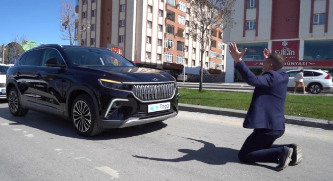 Yolda gördüğü Togg’un önünde diz çöken bir vatandaş, “Gel baba gel” diyerek, “100 yıl oldu 100... Allah kavuşturdu. Allah’a kurban olayım. Memleketimize Allah hayırlı uğurlu etsin” şeklinde dua etti ve arabayı öptü.