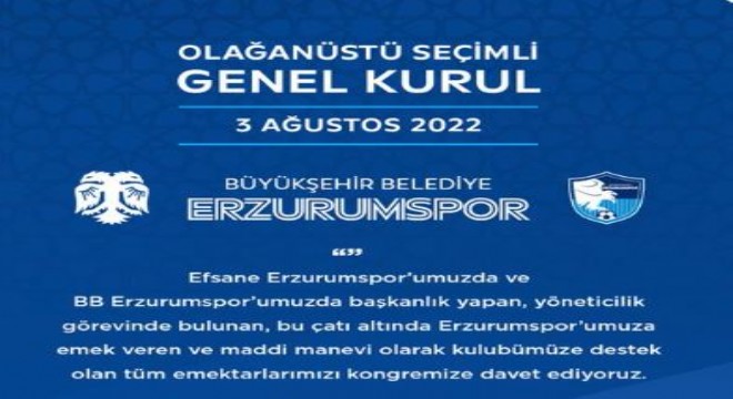 Erzurumspor Kurumsal Web sitesinde Genel Kurul’a iliştin olarak yapılan duyuruda, ‘Efsane Erzurumspor’umuzda ve BB Erzurumspor’umuzda başkanlık yapan, yöneticilik görevlerinde bulunan, bu çatı altında Erzurumspor’umuza emek veren ve maddi, manevi olarak kulübümüze destek olan tüm emekdarlarımızı kongremize davet ediyoruz. Katılımlarından onur duyacağız. Kongremiz camiamıza hayırlı olsun. ‘ ifadelerine yer verildi.