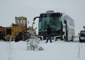 Erzurum-Bingöl Karayolu’nda kar küremesi yapan greyder ile yolcu otobüsünün çarpışması sonucu meydana gelen trafik kazasında 1’i ağır 4 kişi yaralandı.