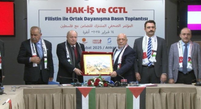 Filistin'deki sorunlarında 70 yılı aşkındır sürdüğünü söyleyen Genel Başkan Arslan, "Bugün burada ortak bir deklarasyon yayınlarının Filistin'de olan tüm dayanışmamızı bir kez daha göstereceğiz. Filistin sorunu 1948'de siyonist devletin kurulmasıyla başladı. Bağımsız ve özgür bir Filistin Devleti kendi topraklarında bütüncül şekilde kuruluna kadar konfederasyon Hak-İş olarak desteğimizi ve mücadelemizi sürdüreceğiz. Her türlü engellemeye rağmen doğrudan Gazze'ye bazı yardımlarımızı, maddi yardımlarımızı ulaştırdık. Hala yardımlarımız devam ediyor. Geçtiğimiz bir ay süreyle Gazze'nin tam orta yerinde her gün on bin kardeşimize sıcak yemek vermeyi başardık. Gazze direnişini sonuna kadar desteklemeye, onlara her konuda destek olmaya devam edeceğiz. Sendikalarımızın, üyelerimizin yardım kampanyası devam ediyor. Bu kampanyaya destek veren bütün sendikalarımıza, üyelerimize teşekkür ediyorum" dedi.