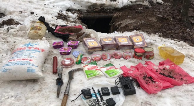 Açıklamada, “1 Adet El Telsizi, 3 Adet Telsiz Bataryası, 1 Adet Şarj Cihazı, 2 Adet Telsiz Anteni, 1 Adet Kazma, 100 Adet Poşet, Muhtelif Gıda ve Yaşam Malzemesi ele geçirilmiştir” denildi.