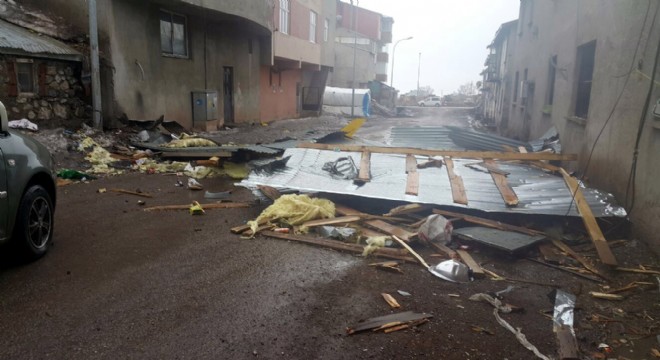 Horasan ve Karayazı ilçelerinde etkili olan fırtına evlerin ve okulların çatılarını uçurdu.