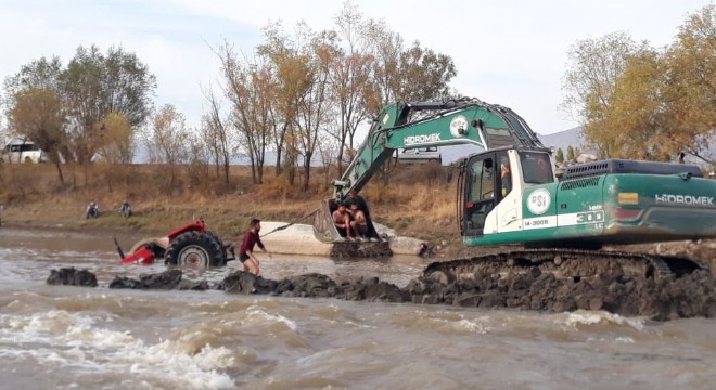 Erzincan’ın Balıbey köyü sınırları içeresinde nehirden karşıdan karşıya traktörü ile geçmeye çalışan bir vatandaşa ait traktörün batması yürekleri ağızlara getirdi. Olayın meydana geldiği bölgenin yakınında drenaj temizliği yapan Devlet Şu İşleri 82’nci Şube Müdürlüğünün ekskavatöründen yardım istendi. Karasu nehrinde önce iş makineleriyle suyun yönü kısmen değiştirilerek, traktörün battığı yerde suyun debisi düşürüldü. Ekskavatörün kepçesine köylüler binip suda gömülü traktöre halat bağlayarak batan traktör uzun uğraşlar sonucunda çekerek sudan çıkarıldı.