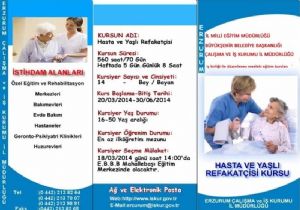 ELİF HASANÇEBİ-ERZURUM (İHA) - Erzurum Büyükşehir Belediye Başkanlığı ile Çalışma ve İş Kurumu İl Müdürlüğü iş birliği ile Hasta-Yaşlı Refakatçisi ve Özürlü Bakımı kursu açılacağı bildirildi.Erzurum İl Milli Eğitim Müdürlüğü koordinesinde, Erzurum Büyükşehir Belediye Başkanlığı ile Çalışma ve İş Kurumu İl Müdürlüğü iş birliği ile Hasta-Yaşlı Refakatçisi ve Özürlü Bakımı kursu açılacak. Açılacak olan kurs ücretsiz olup iş arayanlar için bir fırsat değeri taşıyacak.