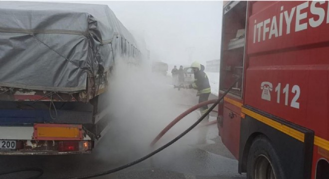 Erzincan’da balatalarının ısınması sonucu lastikleri yanan membran yüklü tır itfaiye ekipleri tarafından söndürüldü.