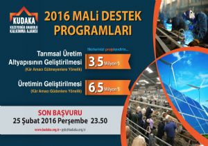 Programlar kapsamında kar amacı gütmeyen kurumların faydalanabileceği asgari destek miktarı 187.5 bin TL, azami destek oranı ise 875 bin  TL iken kar amacı güden kuruluşlar için asgari destek oranı 20 bin TL, azami destek oranı 500 bin  TL’dir. Son başvuru tarihi 25 Şubat 2016 Saat 23:50 olarak belirlenen programlara başvuru yapmak isteyenlerin söz konusu gün ve saate kadar projelerini Kalkınma Ajansları Yönetim Sistemi (KAYS) üzerinden hazırlamış ve tamamlamış olmaları gerekmektedir. “Tarımsal Üretim Altyapısının Geliştirilmesi” ve “Üretimin Geliştirilmesi” Mali Destek Programlarının başvuru rehberlerine ve gerekli diğer dokümanlara www.kudaka.org.tr/pyb adresi üzerinden ulaşabilirsiniz. Mali destek programları kapsamında yapılacak bilgilendirmeler için öngörülen takvim aşağıda belirtilmiştir. Toplantıların yapılacağı salonlar ve takvimde yapılabilecek olası güncellemeler aynı web adresinden ilan edilecektir.’