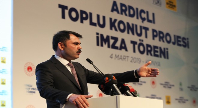 Çevre ve Şehircilik Bakanı Murat Kurum Mevlana Kültür Merkezi'nde gerçekleştirilen ve Konya Büyükşehir Belediyesi ve TOKİ işbirliğinde hayata geçirilecek Ardıçlı Toplu Konut Projesi imza törenine katıldı. Törende konuşan Çevre ve Şehircilik Bakanı Murat Kurum, “Bakanlığımıza bağlı Toplu Konut İdaresi ile Konya Büyükşehir Belediyemiz arasında imzalanacak olan bu sosyal konut projesine ilişkin protokolle birlikte artık Konyamıza bin 57 konutu daha kazandırmış oluyoruz. Bu konutlarda gerçekten çevreye ve doğal yapıya uyumlu sosyal donatı ve hizmet alanlarına sahip, teknik altyapısı tamamlanmış, nitelikli ve sağlıklı yaşam alanlarını içeren çok önemli bir proje. Bizim ecdadımız, medeniyetimiz bize cami merkezli, bahçe merkezli şehirleşmeyi tarif ediyor. Biz de inşallah Cumhurbaşkanımızın da yarın katılacağı lansmanla birlikte bu anlayışı tüm Türkiye’ye yayacak çok önemli bir projeyi de inşallah zemin +4'ü zemin +5'i geçmeyecek çok önemli bir yapılaşma sürecini de bu süreçte tamamlamış olacağız. Planlama yaptığımız alan içerisinde 150 bin metre kare konut alanımız var. Ancak bu alan bütününde çok daha fazla. Başkanımız dedi ki bin 57 konut Konya’ya yetmez. Biz buradan şunun sözünü verelim ilk etapta bin 57 konutu yapalım, ikinci etapta bin konutun hazırlığına da arkadaşlarımız başlasın" ifadelerini kullandı.