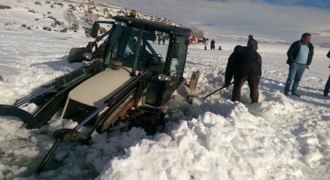 Ardahan’ın kısmen donan Çıldır Gölü’nde buzun kırılması sonucu göle gömülen iş makinesi için kurtarma operasyonu başlatıldı.