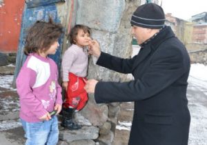 Yoncalık semtinde tek katlı eski bir evde yaşamlarını sürdüren Ayşe(5) ile Aliye(3), 2015 yılının ilk hediyelerini Yakutiye Belediye Başkanı Ali Korkut'un elinden aldılar.