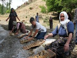 ERZURUM (İHA) - Oltu Taşı'nın çıkarıldığı ocakları yerinde görmek üzere Dutlu köyüne giden Avrupalı turist kafilesindeki bayanlar, derede yün tokaçlayan köylü kadınlara özendi.