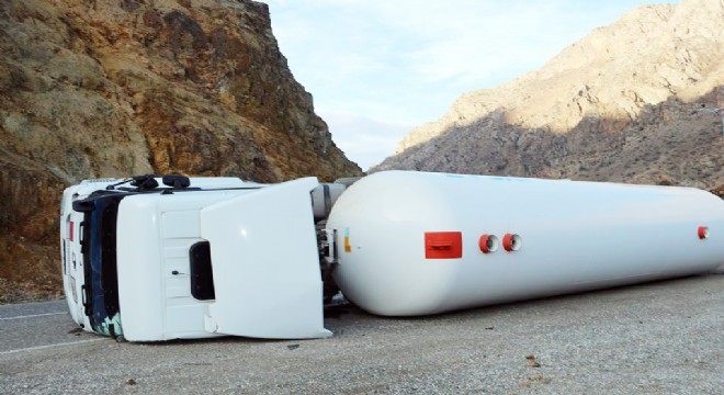 Oltu ilçesinde keskin virajı alamayan LPG yüklü tanker devrildi. Kazanın ardından yol trafiğe kapatıldı.