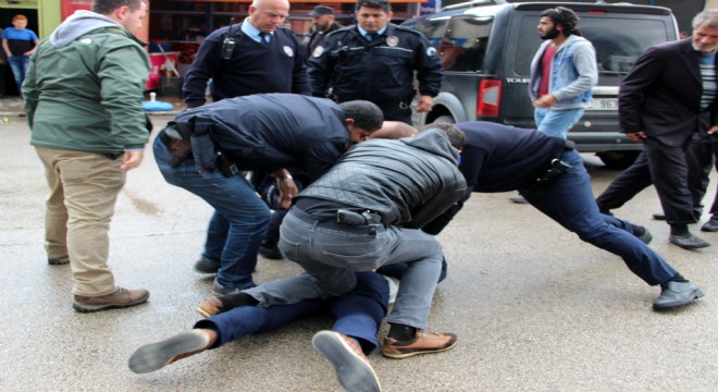 Erzurum’da iki esnaf grubu arasında çıkan, bıçak ve bastonların kullanıldığı kavgada 7 kişi yaralandı. Polis saldırganları etkisiz hale getirip yere yatırarak ellerini kelepçeledi.