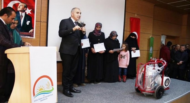 Kursu başarı ile bitiren kadın çiftçilere katılım belgeleri ile süt sağım makinası dağıtımı yapıldı.