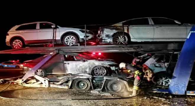 Erzincan’da sıfır kilometre otomobil yüklü tır yandı. Yangında tırın teker kısımlarıyla 4 otomobil hasar gördü.
