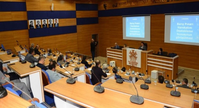 Belediye Meclis salonunda gerçekleşen olağanüstü toplantı sonrasında 'Barış Pınarı Harekâtı’na destek amacıyla İstiklal Marşı okunup, asker selamı verildi.