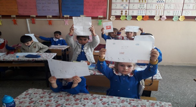 Milli Egemenlik İlkokulu 1/A sınıfı öğrencileri Zeytindalı Harekatına katılarak Afrin'de teröristlerle mücadele eden kahraman askerlerimiz için resimler yapıp, duygularını ifade eden mektuplar yazdılar. Minik yürekleri vatan, millet ve bayrak sevgisiyle dolu minik öğrenciler askerlerimize dua ettiklerini, onların sayesinde rahat uyuduklarını ve okula gelebildiklerini ifade ettiler.
