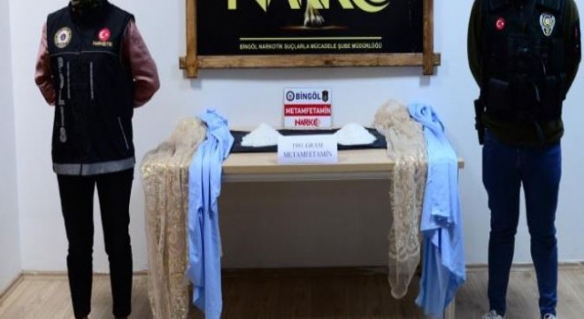 Bingöl İl Emniyet Müdürlüğüne bağlı Narkotik Suçlarla Mücadele Şube Müdürlüğü ekipleri, uyuşturucu madde imal ve ticaretini önlemek amacıyla çalışma gerçekleştirdi. Kentte, Doğu illerinden gelen kargo firmaları aracılığıyla uyuşturucu madde sevkiyatı yapılacağı yönünde istihbarat alınması üzerine kargo firmaları çevresinde tertibat alındı. Bir şüpheli üzerinde yapılan çalışmada, kargo poşetine konulan perdelerin arasına saklanmış vaziyette 1 kilo 981 gram metamfetamin ele geçirildi.