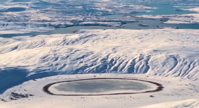 İliç Belediye Başkanı Mehmet Elçi’nin paylaştığı görüntüler ilgi görürken, yaklaşık 350 metre çapındaki ve jips erimesiyle oluşan göl, kış mevsiminde farklı bir görünüme büründü.