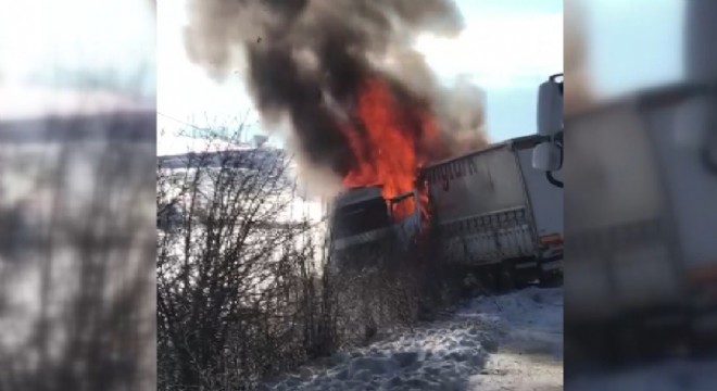 Karlı ve buzlu zeminde kayarak yoldan çıkan tır alev alev yandı.
