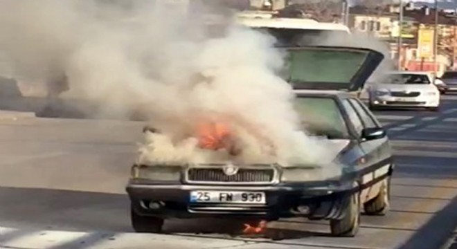 Palandöken Devlet Hastanesi karşı tarafı ana yol üzerinde meydana gelen olayda, sürücüsünün ismi öğrenilemeyen 25 FN 930 plakalı otomobil, seyir halindeyken aniden yanmaya başladı.