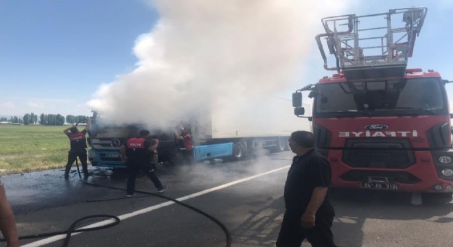 Ağrı-Erzurum Karayolunda seyir halindeyken alev alan tır, itfaiye ekiplerinin müdahalesi ile söndürüldü.