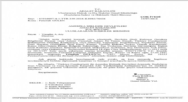 Adalet Bakanlığı tarafından Gülen'in iadesine ilişkin olarak ABD'ye gönderilen yazıların örnekleri ve Amerika Birleşik Devletleri Adalet Bakanlığı tarafından iade evraklarının teslim alındığına ilişkin resmi yazılar ortaya çıktı. Adalet Bakanlığı Uluslararası Hukuk ve Dış İlişkiler Genel Müdürlüğü tarafından 19 Temmuz 2016 tarihinde ABD Adalet Bakanlığı Suç Bölümü Uluslararası İlişkiler Birimine yazılan yazıda Fetullah Gülen’in geçici olarak tutuklanması talep ediliyor.