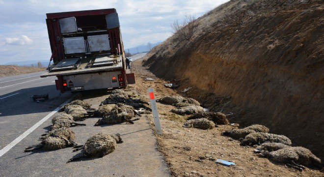 Sivas'ın Suşehri ilçesinde devrilen tırın kasasında bulunan 320 küçükbaş hayvandan 33'ü telef oldu.