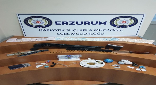 Erzurum’da düzenlenen uyuşturucu operasyonunda 117 gram bonzai, 25 gram toz esrar, 2 gram metamfetamin, 22 adet tabanca mermisi, 1 adet pompalı tüfek, 2 adet bıçak ele geçirildi.