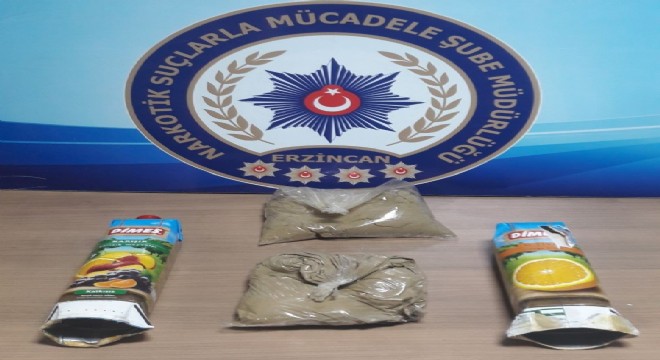 İl Emniyet Müdürlüğü Narkotik Suçlarla Mücadele Şube Müdürlüğü ve KOM Şube Müdürlüğü görevlilerince 14.02.2018 tarihinde Erzincan-Erzurum karayolu üzerinde yapılan yol uygulamasında; Yolcu otobüsünde bulunan ve durumundan şüphelenilen İran Uyruklu R.K.(26) isimli şahsın oturduğu koltuğun altında bulunan poşete yönelik olarak Narkotik köpeğiyle yapılan aramada iki adet meyve suyu kutusu içerisine gizlenmiş vaziyette toplam ağırlığı 1004,91 gr olan eroin maddesi ele geçirildi.